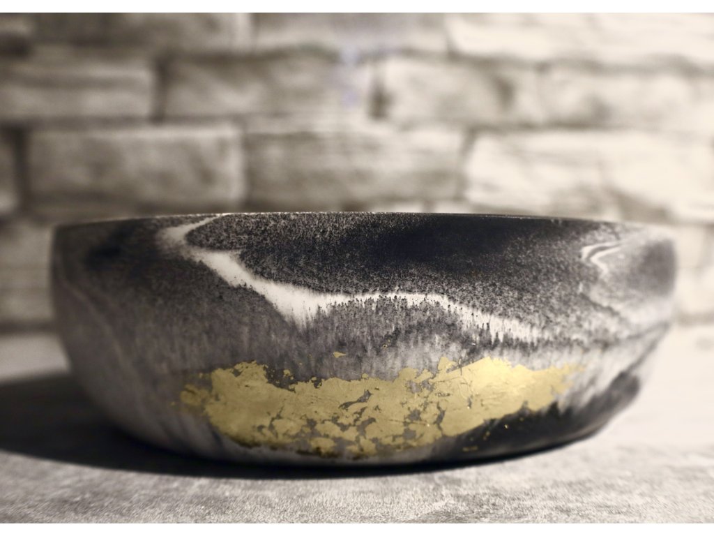 Vyrobena z ekologické pryskyřice, je nejen krásná na pohled, ale i šetrná k přírodě, odolná a hladce lesklá. Vnější plochu zdobí pravé plátkové zlato, které připomíná záblesky dávných pokladů – jemný kontrast k jednoduchosti černé a bílé.