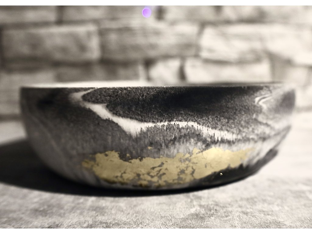 Každá miska je ručně odlévaná. Přírodní nepravidelnosti ve struktuře, vrstvení odstínů a rozmístění zlata dávají každému kusu jedinečný charakter a hloubku. V tom spočívá její krása – v nedokonalosti, která vypráví příběh.