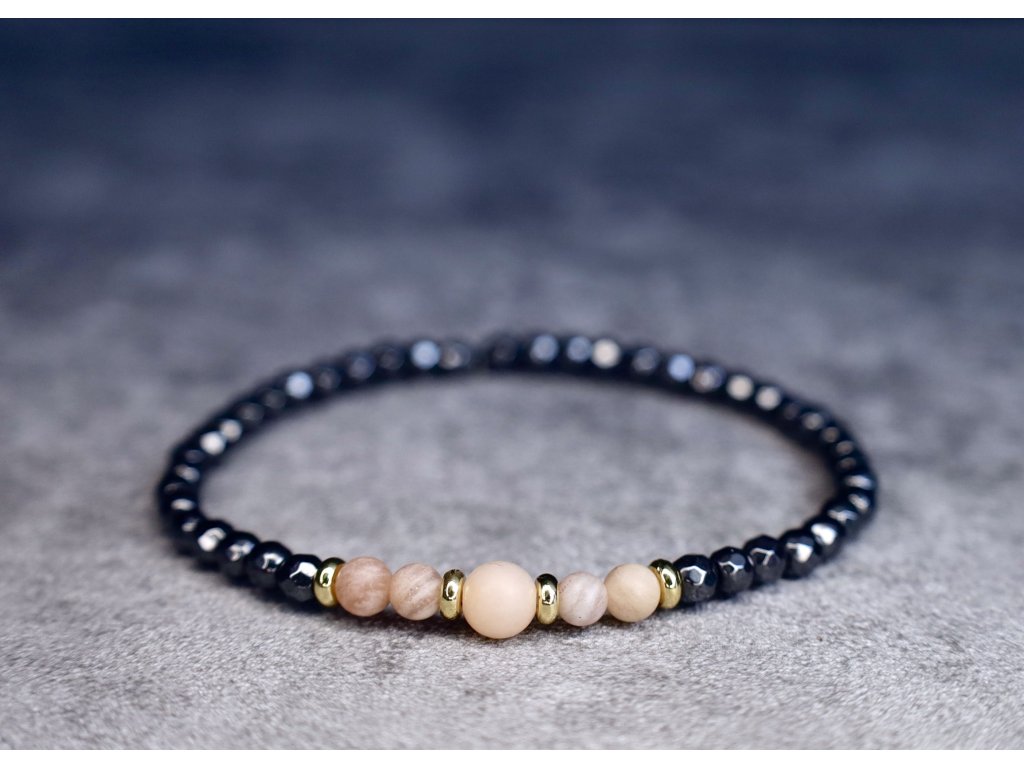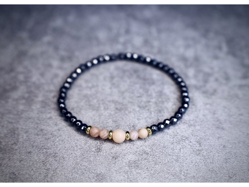 Většinu náramku tvoří fasetovaný hematit, jehož kovový lesk dodává nejen vizuální eleganci, ale i energetickou stabilitu. Středovou dominantu tvoří jeden korálek avanturínu, který náramku propůjčuje jemně zelený nádech a vibrace růstu, klidu a důvěry. Po jeho stranách najdete čtyři korálky slunečního kamene, který rozjasňuje náladu a podporuje radost ze života.