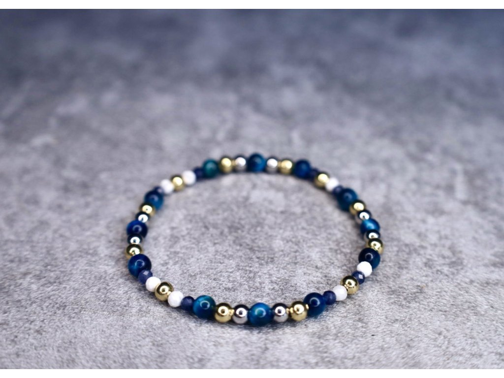 Materiál: modré tygří oko (4 mm), howlit (2 mm), safír 2mm (fasetovaný), chirurgická ocel – zlatý a stříbrný korálek