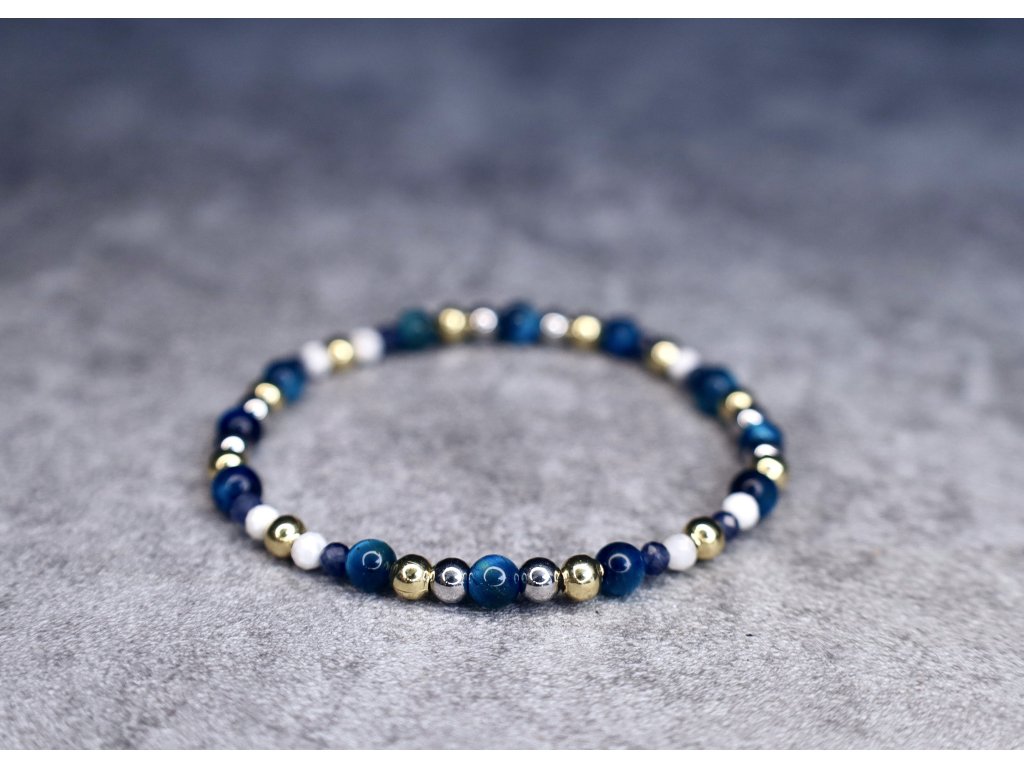 Minimalistický náramek Sapphire Horizon propojuje chladnou hloubku safíru s klidnou energií howlitu a mystickým leskem modrého tygřího oka. Jemné korálky jsou navlečeny na pevném elastomeru, díky kterému se náramek pohodlně přizpůsobí zápěstí. Doplňují jej detaily z chirurgické oceli ve stříbrném a zlatém odstínu – symbol rovnováhy mezi ženským a mužským principem.