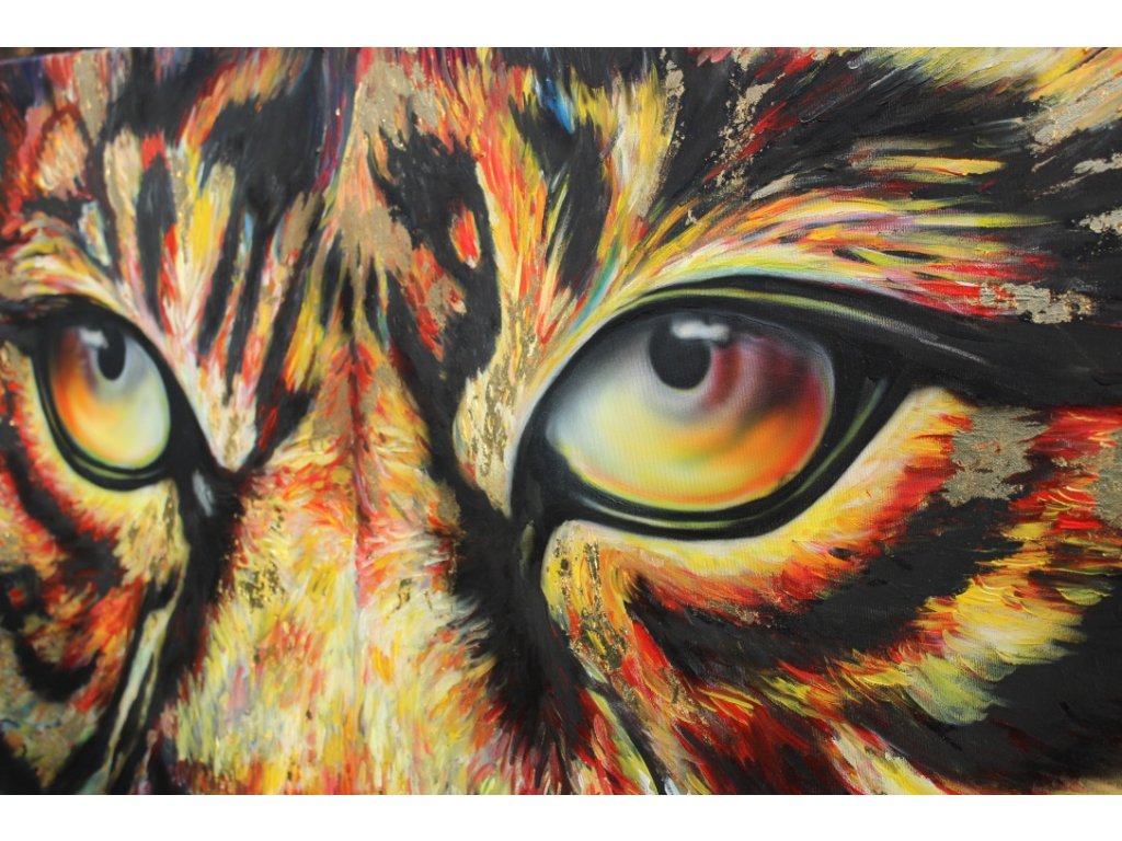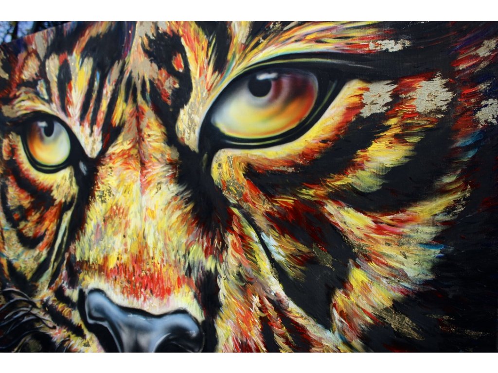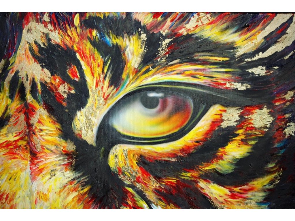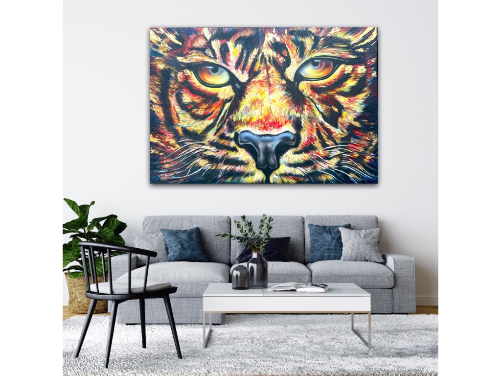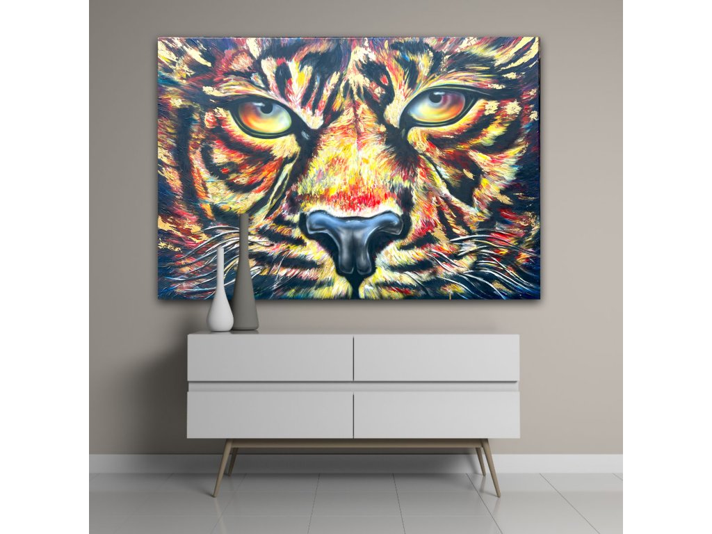 Silný, živelný a nepřehlédnutelný – tento velkoformátový obraz tygra přináší do prostoru nezkrotnou sílu, vnitřní oheň a zemitou vášeň. Tygr je ztvárněn v odstínech sytě žluté a karmínové červeně, které se prolínají v expresivní abstraktní kompozici a evokují divokost i duchovní bdělost.